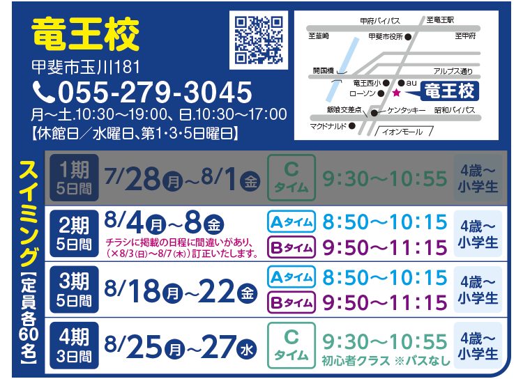 【Aタイム】 甲斐市(竜王小・竜王北小・竜王東小・竜王南小・竜王西小・玉幡小 各学区) 甲府市(貢川小学区アルプス通り沿い・徳行) 【Bタイム】 昭和町(常永小・押原小・西条小 各学区) 中央市(田富小・田富北小・三村小・玉穂南小 各学区) 【Cタイム】※1期のみ(4期はバス無し) 甲斐市(竜王小・竜王北小・竜王東小・竜王南小・竜王西小・玉幡小 各学区) 甲府市(貢川小学区アルプス通り沿い・徳行) 昭和町(常永小・押原小・西条小 各学区) 中央市(田富小・田富北小・三村小・玉穂南小 各学区) |